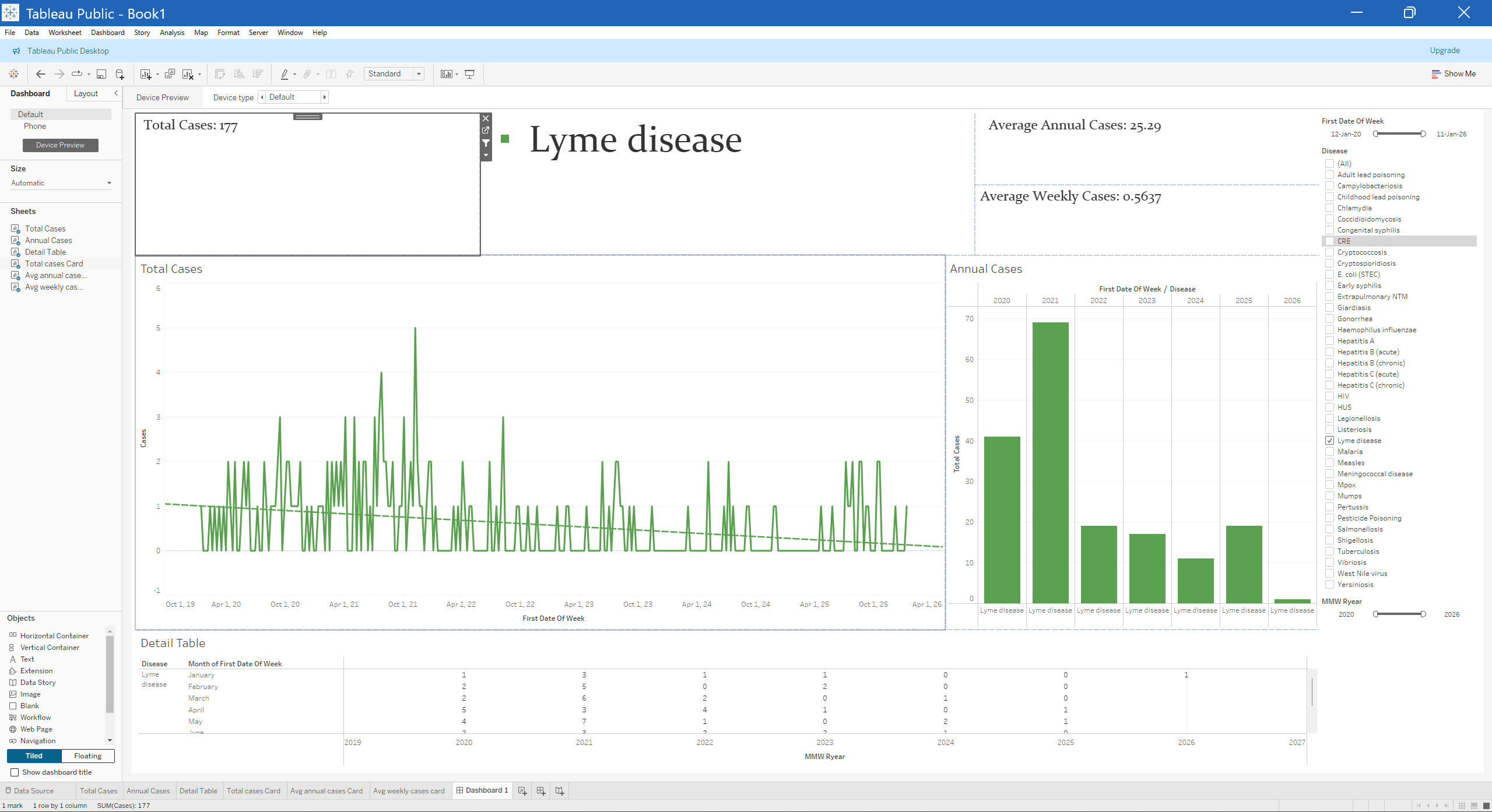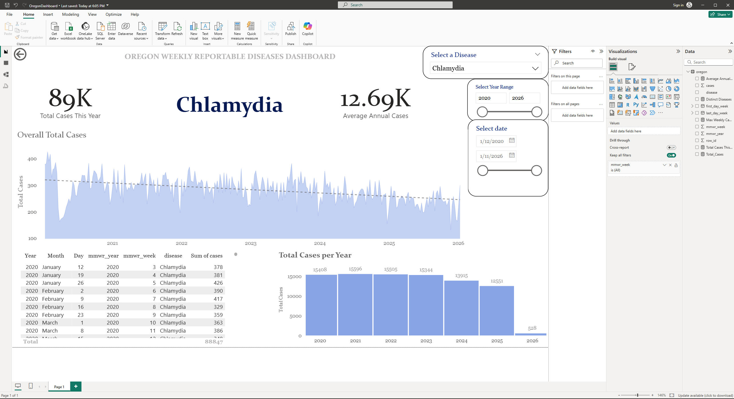 A report page was built with cards (total and average annual cases), weekly time‑series line chart with trend line, yearly bar chart, and a detailed table, all controlled by slicers for disease, year, and date.