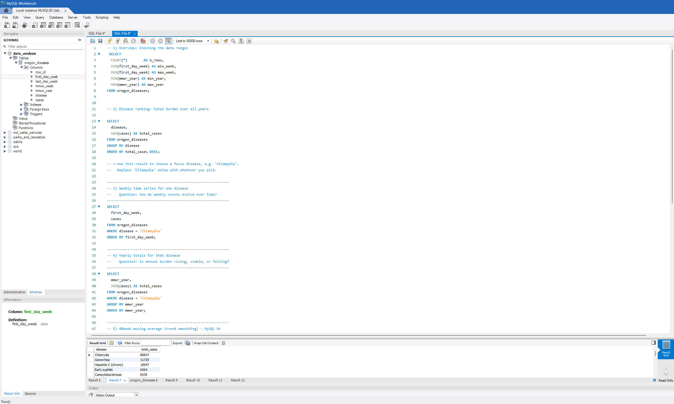 The original dataset was cleaned in Excel (date formatting to yyyy-mm-dd) and loaded into a MySQL table oregon_diseases using LOAD DATA LOCAL INFILE for aggregate analysis.