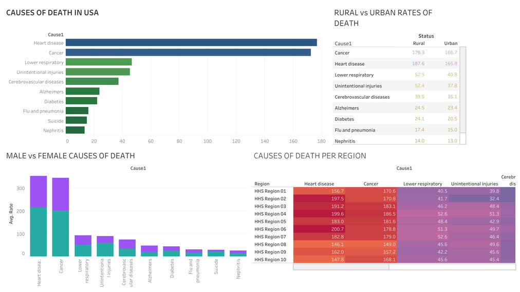 Data cleaning and transformation for Tableau import.Visual exploration of multi-dimensional data (age, sex, cause, and geography).Dashboard design emphasizing clarity, interactivity, and comparative analysis.Data storytelling to reveal health inequalities behind national averages.RecommendationsStrengthen preventive care programs targeting chronic conditions in rural areas.Develop age- and gender-specific safety interventions to reduce external-cause mortality.Use data-driven communication to inform equitable health policy and resource distribution.ReflectionsThis project reinforced my understanding of how visualization transforms raw data into public insight. I learned to balance aesthetic simplicity with analytical depth, ensuring that every chart contributes to a coherent narrative about population health disparities.